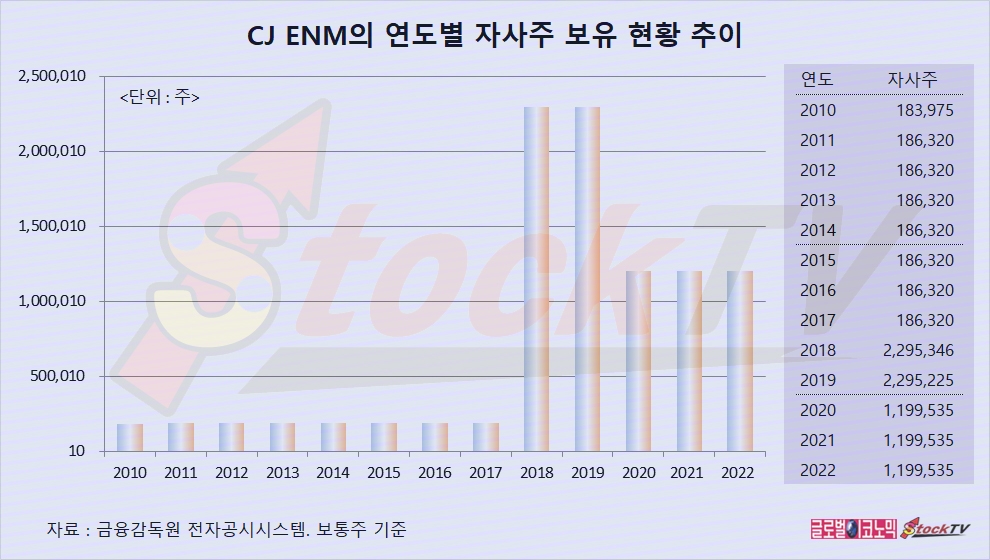 CJ ENM은 2020년 네이버와 주식교환으로 자기주식 109만5690주를 처분해 자기주식이 119만9535주로 줄었고 2022년 말까지 그대로 유지하고 있습니다.