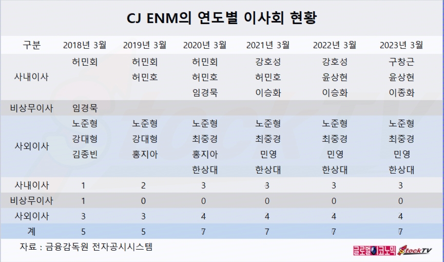 CJ ENM 이사회는 올해 3월말 기준으로 사내이사 3명과 사외이사 4명 등 모두 7명으로 구성되어 있습니다.