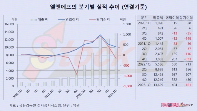 엘앤에프의 2023년 1분기 연결기준 매출액은 1조3629억원으로 전년동기보다 2.5배 급증했습니다.