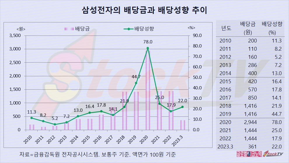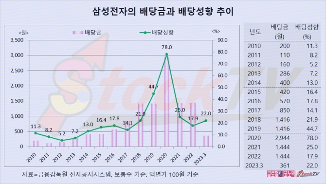 삼성전자는 2023년 1분기 보통주 1주당 361원의 배당을 실시했습니다. 2023년 연간으로는 주당 1444원 규모로 예상됩니다.