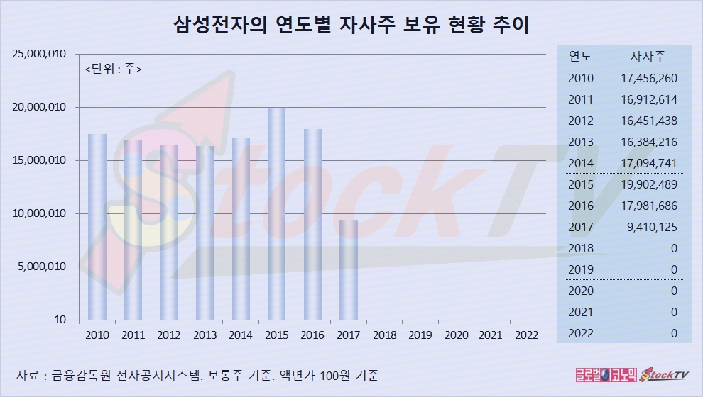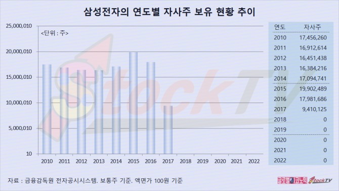 삼성전자는 지난 2017년 장내에서 자기주식을 300만9282주 취득했고 1158만843주를 소각해 자사주를 941만125주로 줄였습니다.