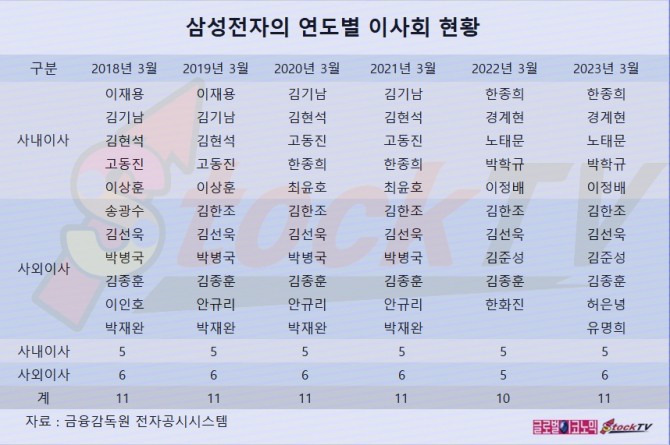 삼성전자 이사회는 2023년 3월 기준으로 사내이사 5명과 사외이사 6명 등 모두 11명으로 구성되어 있습니다.