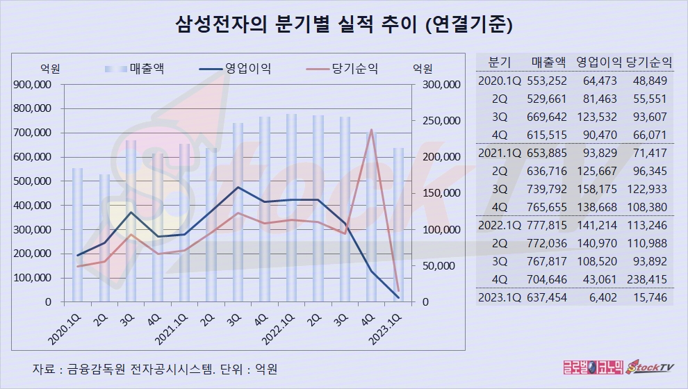 삼성전자의 2023년 1분기 연결기준 매출액이 63조7454억원으로 전년동기보다 18% 감소했습니다.