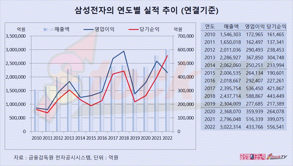 삼성전자의 연도별 실적은 기복이 크지만 꾸준하게 성장하는 모습입니다.