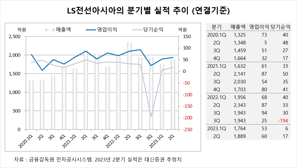 대신증권은 LS전선아시아의 2분기 연결기준 매출액이 1889억원, 영업이익이 60억원, 당기순이익이 17억원에 이를 것으로 전망하고 있습니다.