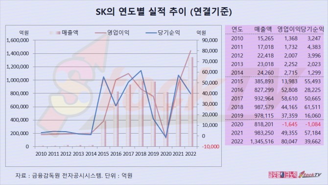 SK의 연도별 실적은 급변하지만 성장세를 보이고 있습니다.