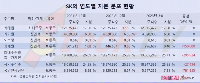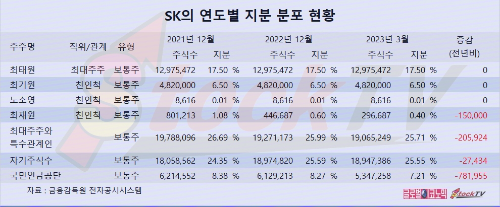 SK는 최태원 회장의 동생인 최재원 수석부회장이 올해들어 주식을 15만주 장내 매각하며 지분을 낮췄습니다.