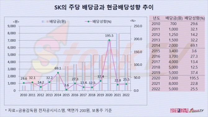 SK는 2022년 1주당 5000원의 배당금을 지급했고 배당성향이 25.5%입니다.