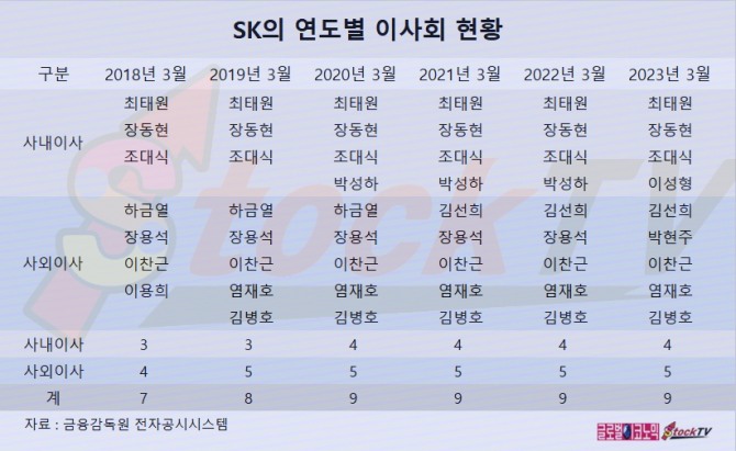 SK 이사회는 2023년 3월 기준 사내이사 4명, 사외이사 5명으로 모두 9명으로 구성되어 있습니다.