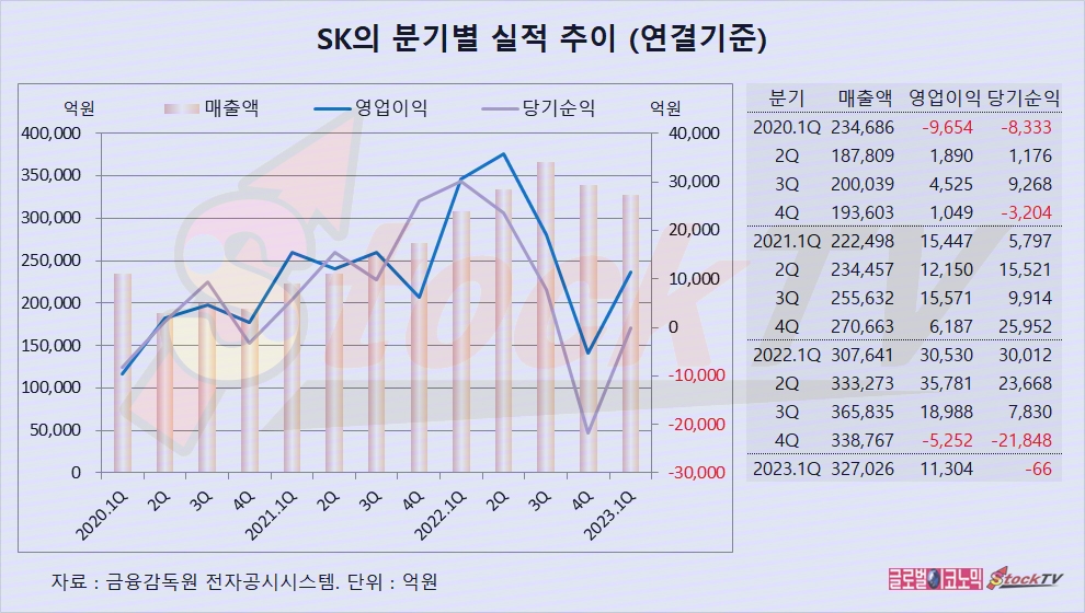 SK는 1분기 연결기준 영업이익이 1조1304억원으로 전년동기보다 63% 줄었고 당기순이익은 -66억원으로 전년동기 흑자에서 적자로 전환했습니다. 당기순이익은 전분기에 이어 2개 분기째 적자가 계속되고 있습니다.