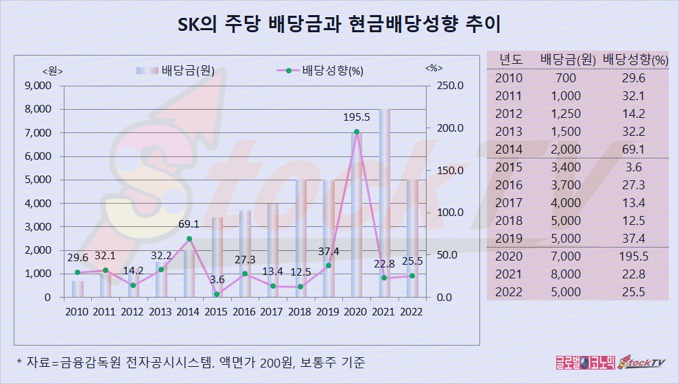 SK는 2021년 1주당 8000원의 배당을 실시했고 배당성향이 22.8%로 나타났습니다.