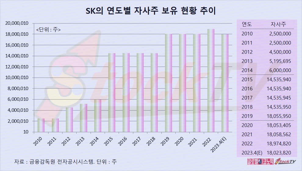 SK는 2023년 4월 기준으로 자기주식을 1897만4820주를 보유한 것으로 보입니다.
