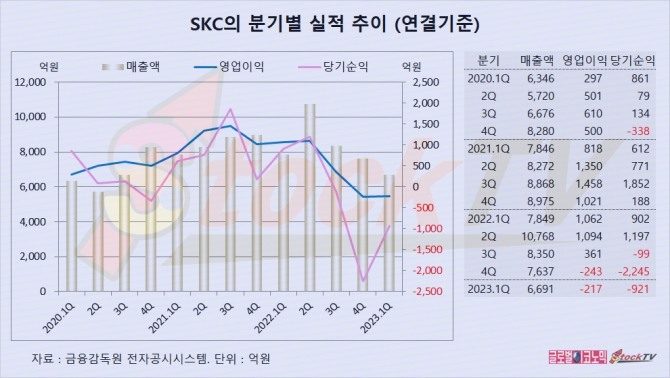 SKC는 1분기 연결기준 영업이익이 -217억원으로 전년동기 흑자에서 적자로 전환했고 당기순이익이 -921억원으로 전년동기 흑자에서 적자로 돌아섰고 3개 분기째 적자가 계속되고 있습니다.