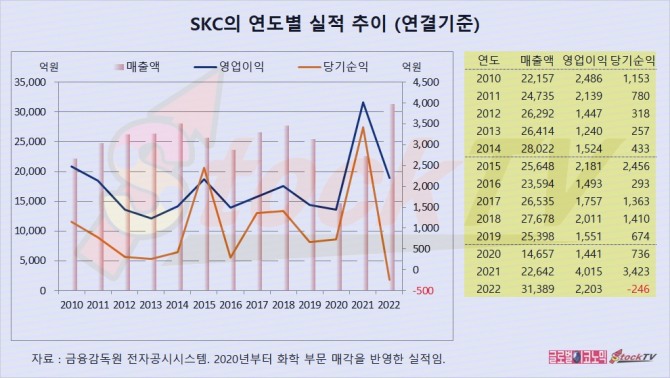 SKC의 연도별 실적은 화학 부문 매각이 2020년부터 재무제표에 반영되면서 매출액, 영업이익, 당기순이익이 예전보다 줄어든 것으로 나타났습니다.