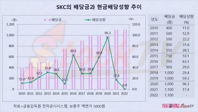 SKC는 2022년 연결기준으로 246억원의 적자가 발생했지만 1주당 1100원의 배당금을 지급했습니다.