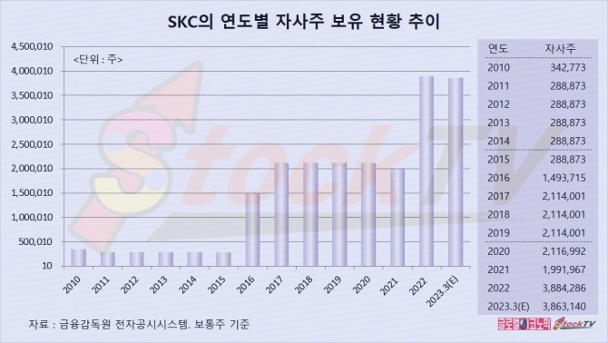 SKC는 2023년 4월 기준으로 자기주식을 386만3140주를 보유한 것으로 보입니다.