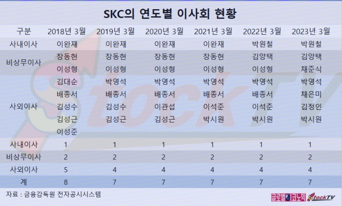 SKC 이사회는 2023년 3월 기준으로 사내이사 1명, 기타비상무이사 2명, 사외이사 4명 등 7명으로 구성되어 있습니다.