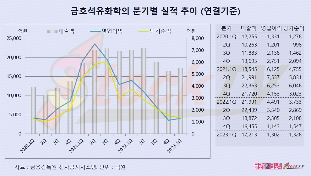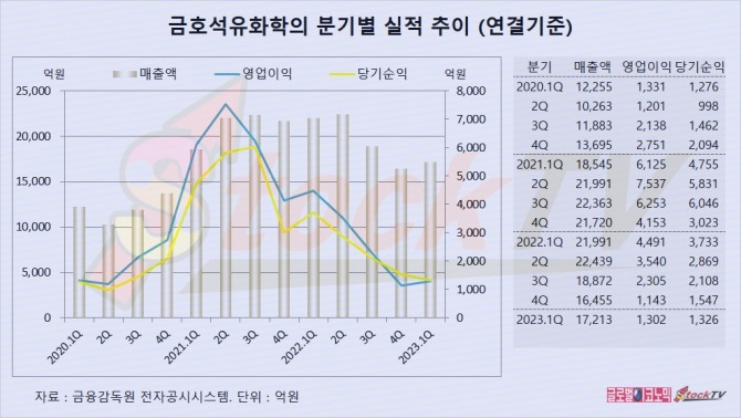 금호석유화학은 1분기 연결기준 영업이익이 1302억원으로 전년동기보다 71% 급감했고 당기순이익은 1326억원으로 전년동기에 비해 65% 줄었습니다.