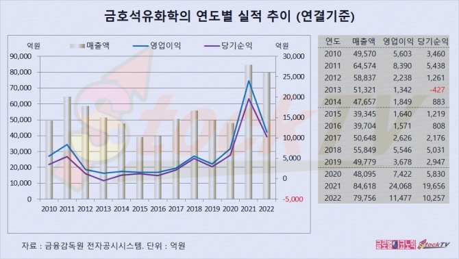 금호석유화학의 연도별 실적은 급성장한 후 한풀 꺾인 모습입니다.