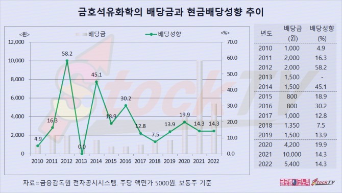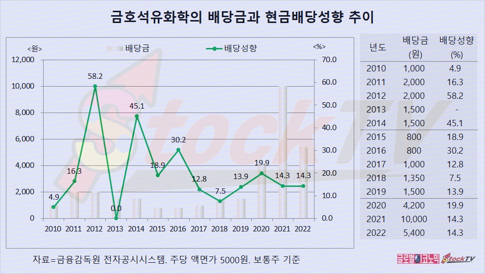 금호석유화학은 2022년 1주당 5400원의 배당금을 지급했고 연결현금배당성향은 14.3%입니다.