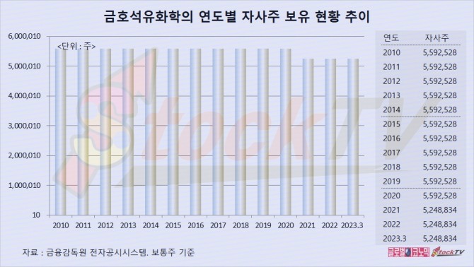 금호석유화학은 지난 2005년부터 자기주식 559만2528주를 갖고 있었고 2020년까지 유지해 왔습니다.
