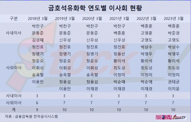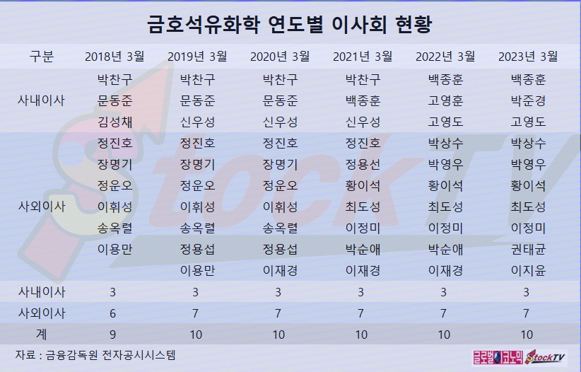 금호석유화학 이사회는 2023년 3월 기준 사내이사 3명, 사외이사 7명 등 모두 10명으로 구성되어 있습니다.
