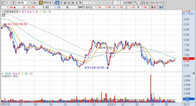 이미지 확대보기DGB금융지주의 주가는 23일 오전 9시 3분 현재 전일보다 20원(0.28%) 오른 7090원에 거래되고 있습니다.