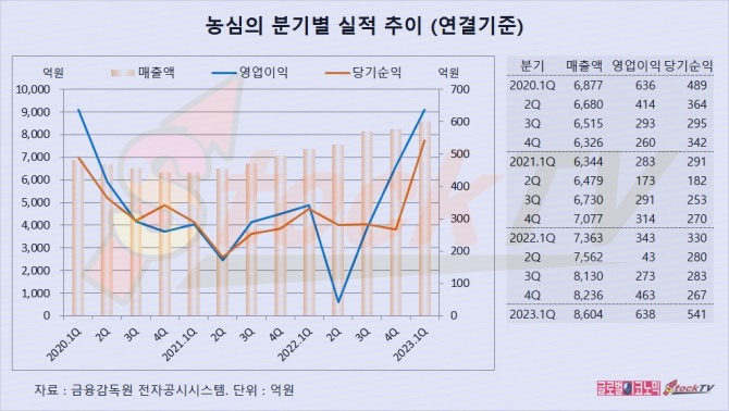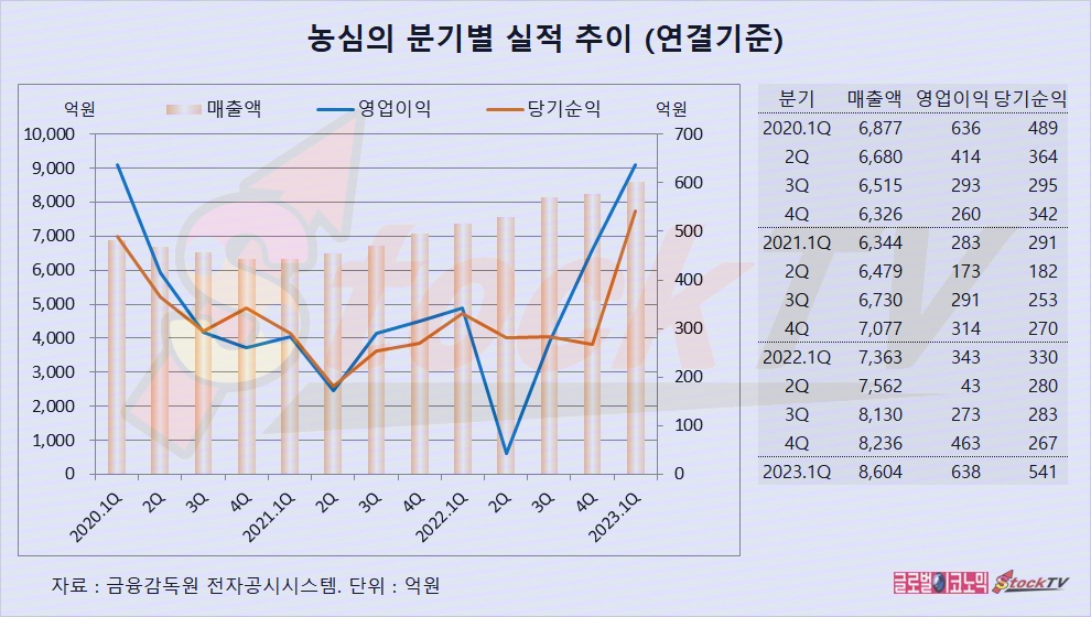 농심의 2023년 1분기 연결기준 매출액은 8604억원으로 전년동기보다 17% 늘었습니다.