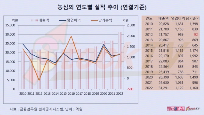 농심의 연도별 실적은 기복이 있지만 성장하는 모습입니다.