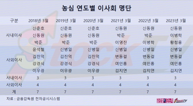 농심의 이사회는 2023년 3월 기준으로 사내이사 3명, 사외이사 4명 등 모두 7명으로 구성되어 있습니다.