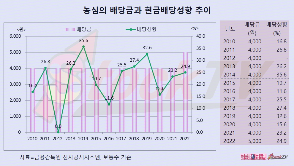 농심은 2022년에 1주당 5000원의 배당금을 지급했고 연결현금배당성향이 24.9%입니다.