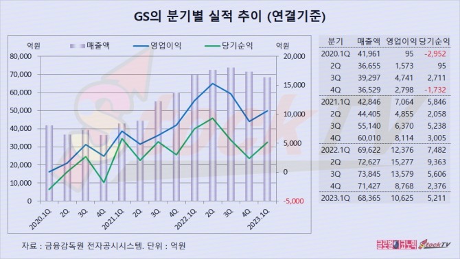 GS의 2023년 1분기 연결기준 매출액은 6조8365억원으로 전년동기보다 2% 줄었습니다.
