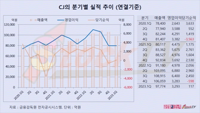 CJ는 1분기 연결기준 영업이익이 3293억원으로 전년동기보다 34% 줄었고 당기순이익이 117억원으로 전년동기에 비해 94% 급감했습니다.