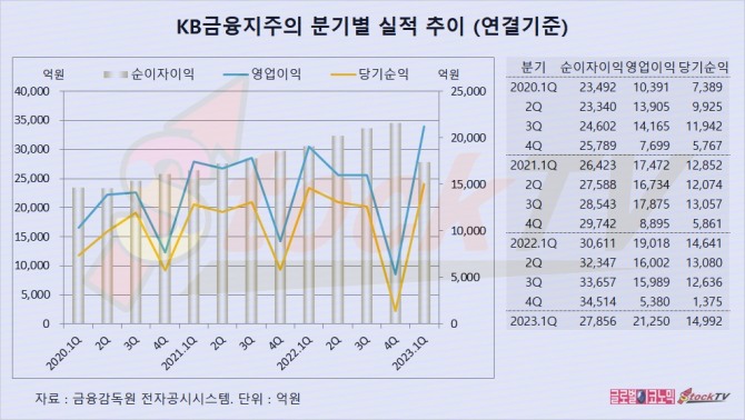 KB금융지주는 1분기 연결기준 영업이익이 2조2150억원으로 전년동기보다 12% 증가했고 당기순이익은 1조4992억원으로 전년동기에 비해 2% 늘었습니다.