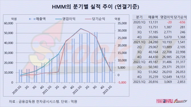 HMM의 2023년 1분기 연결기준 매출액은 2조816억원으로 전년동기보다 58% 감소했습니다.