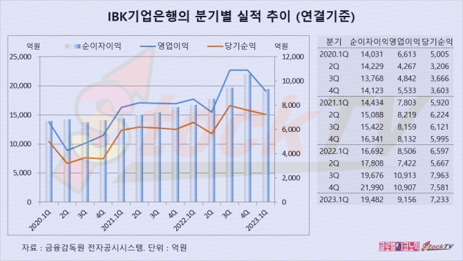 IBK기업은행의 1분기 연결기준 영업이익은 9156억원으로 전년동기보다 8% 늘었고 당기순이익은 7233억원으로 전년동기에 비해 10% 불었습니다.