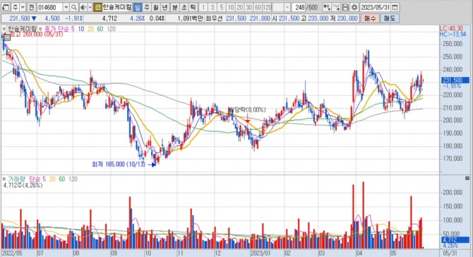 SK증권은 한솔케미칼이 올해 1분기 반도체 업체들의 웨이퍼 투입 축소과 파운드리 가동률 하락 등으로 과산화수소, 프리커서 등 반도체향 소재가 부진했지만 2분기부터 실적이 반등에 나설 것으로 전망해 한솔케미칼에 대해 투자의견 매수와 목표주가 28만원을 그대로 유지했습니다.