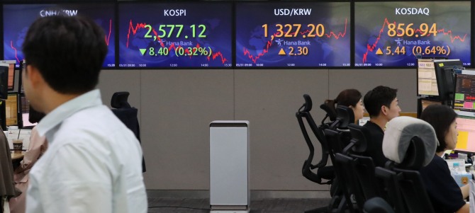 코스피가 하락 마감했다. 월말을 맞아 기관 매물이 크게 증가했다. 31일 한국거래소에 따르면 이날 코스피는 전 거래일 대비 0.32%(8.4포인트) 떨어진 2577.12에 거래를 마감했다.