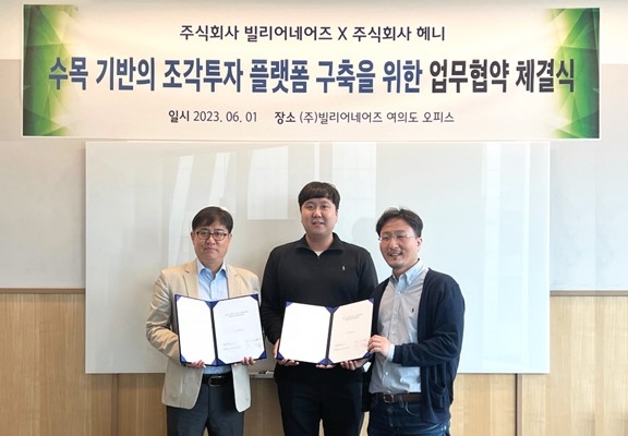 빌리어네어즈의 조현호, 이수한 공동대표는 "헤니와의 협약을 통해 조경 수목 기반의 조각투자 플랫폼을 구축하는 데 필요한 전문적인 노하우와 경험을 확보할 수 있게 되어 매우 기쁘다"며 "이번 협약이 국내 조경 수목 시장에 혁신적인 변화를 가져올 분기점이 될 것이라 확신한다"고 전했다.