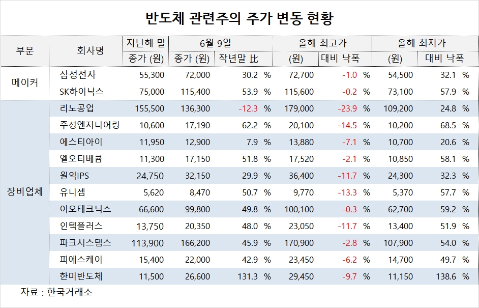 파크시스템스의 주가는 16만6200원으로 작년말보다 45.9%, 피에스케이의 주가는 2만2000원으로 작년말보다 42.9%, 한미반도체의 주가는 2만6600원으로 작년말에 비해 2.3배 급등한 것으로 각각 나타났습니다.