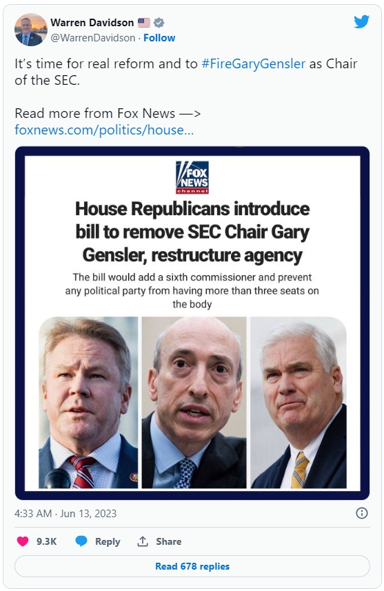 데이비슨 의원은 이날 성명에서 "미국 자본 시장은 현 위원장을 포함한 폭압적인 위원장으로부터 보호되어야 합니다. 그렇기 때문에 저는 현재 진행 중인 권력 남용 문제를 해결하고 향후 수년간 시장에 최선의 이익이 되는 보호를 보장하기 위한 법안을 발의합니다. 이제는 진정한 개혁이 필요하며 게리 겐슬러를 SEC 위원장에서 해임해야 할 때입니다"라고 말했다.