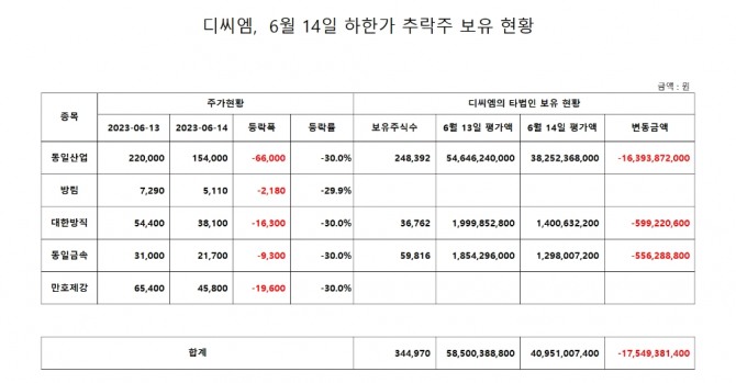 디씨엠의 시가총액 규모가 1500억 규모인 점을 감안하면 전날 보유 종목의 주가 하락으로 하루만에 디씨엠 시가총액의 10%가 넘는 평가 손실을 기록한 셈이다.