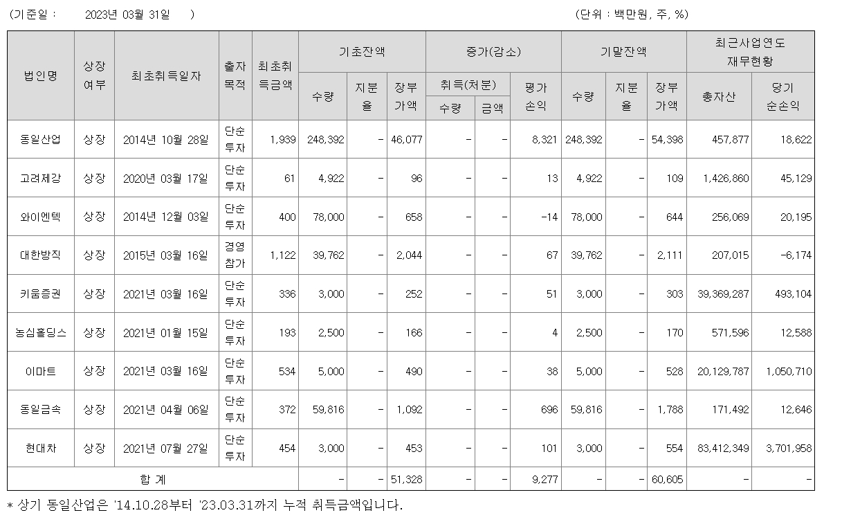 디씨엠의 지난 1분기 보고서에 따르면, 이 회사는 3월 31일 현재 총 9개 종목에서 606억원에 해당하는 타법인 주식을 보유하고 있다. 이 중 동일산업, 동일금속, 대한방직 등 3종목을 보유하고 있는 것으로 나타났다.