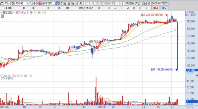 하한가를 기록한 5개 종목은 코스피 시장에서 동일산업, 방림, 만호제강, 대한방직이며 코스닥 시장에서는 동일금속이다.