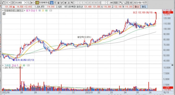 이미지 확대보기한화에어로스페이스의 주가는 19일 오전 9시 50분 현재 전일보다 1만4500원(12.41%) 오른 13만1300원에 거래되고 있습니다. 장중엔 52주 신고가 13만2100원을 찍었습니다.