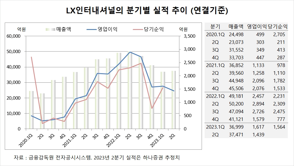 하나증권은 LX인터내셔널의 2분기 연결기준 매출액이 3조7471억원, 영업이익이 1439억원에 이를 것으로 전망하고 있습니다.