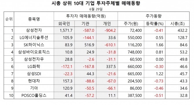 다음은 29일 오후 5시 집계 기준 투자주체별 순매수 / 순매도 상위 종목들의 순매수(순매도는 - 표시) 금액과 수량이다.