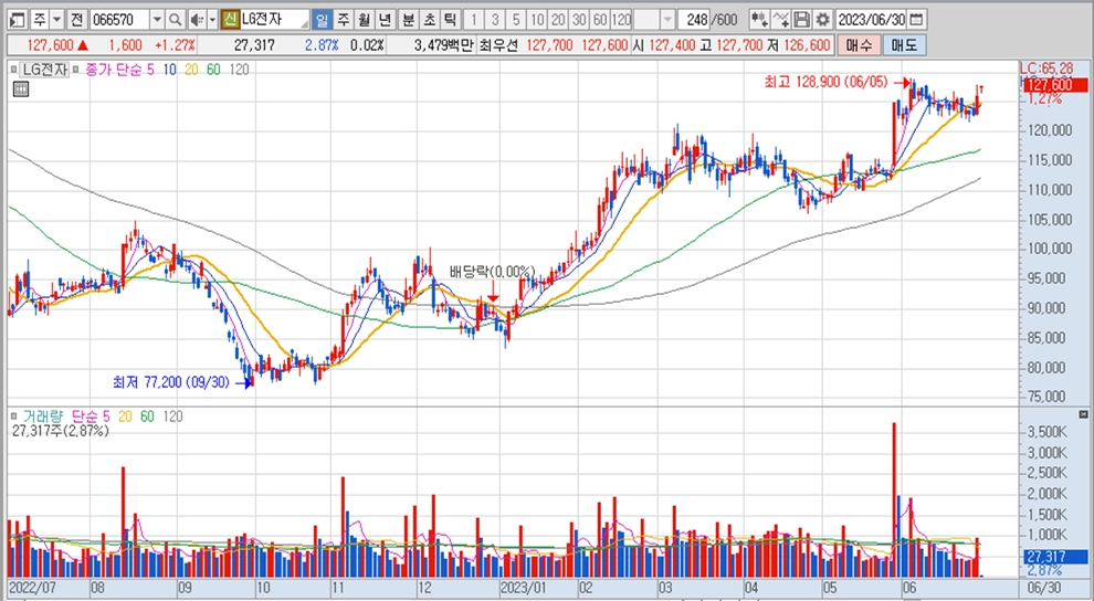 이미지 확대보기LG전자의 주가는 30일 오전 9시 3분 현재 전일보다 1600원(1.27%) 오른 12만7600원에 거래되고 있습니다.