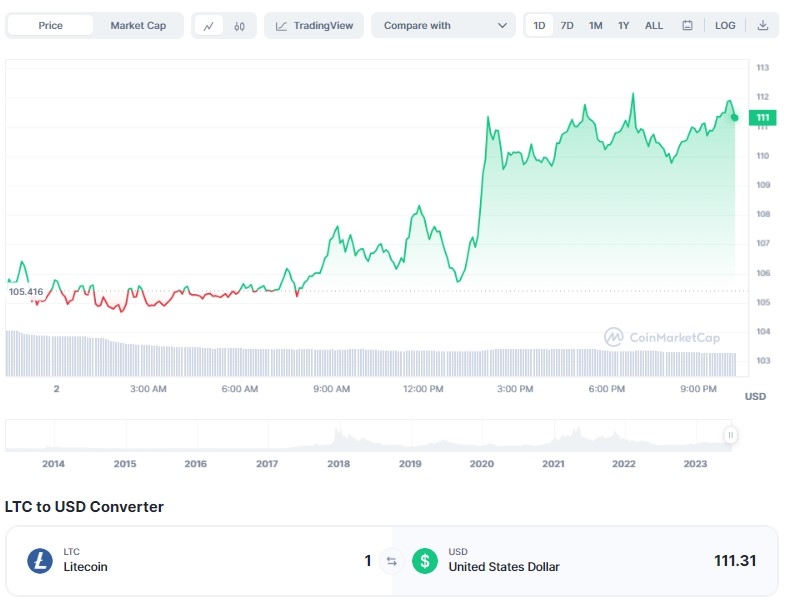 2일 오후 10시 19분 현재 코인마켓캡에서 라이트코인(LTC)은 24시간 전 대비 약 5.6% 폭등해 111.31달러를 기록했다. 라이트코인 주간 상승률은 26.20%에 달했다. 시가총액은 87억5753만달러로 9위를 차지했다. 라이트코인은 올해 초 대비 50% 이상 상승했다.