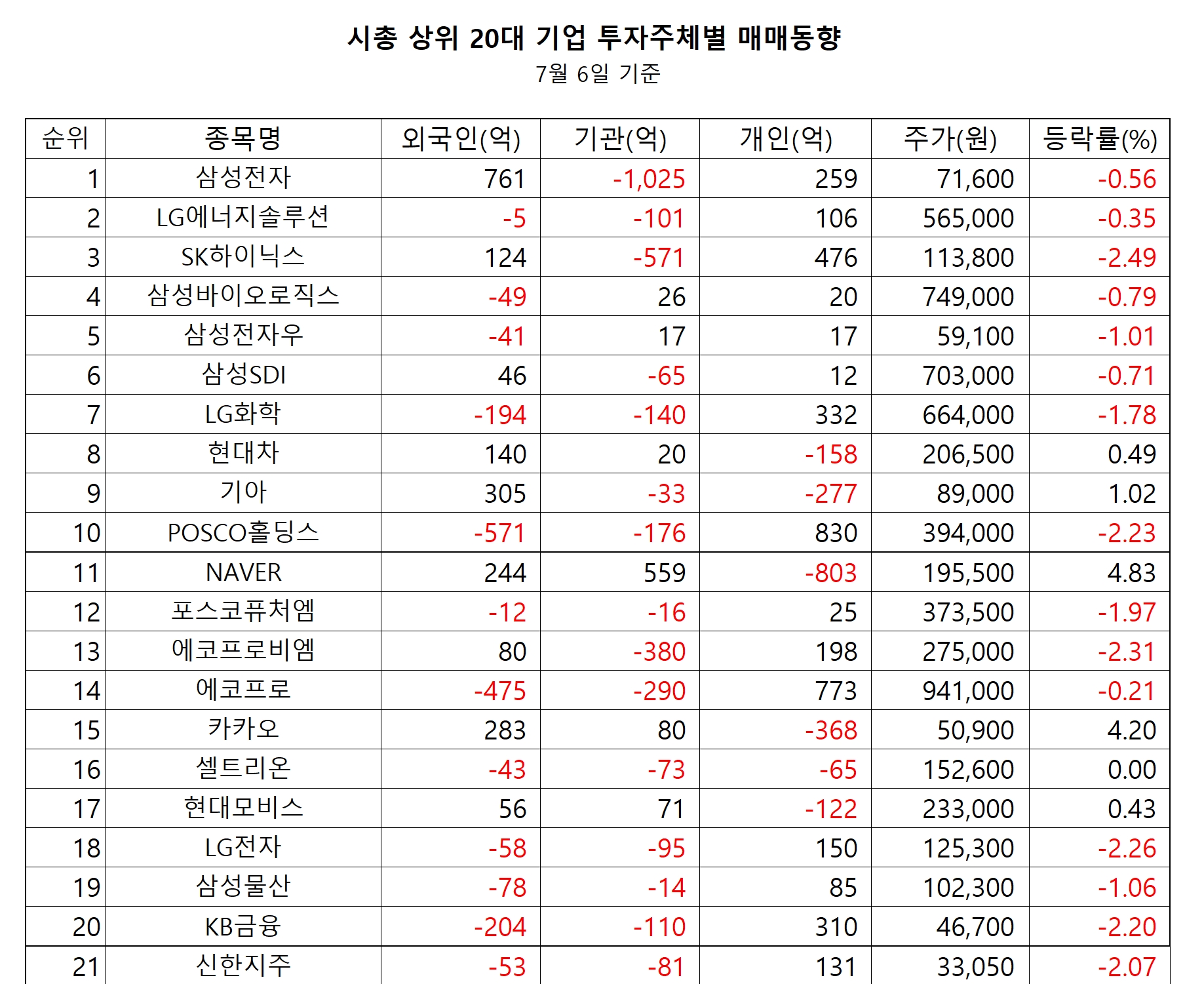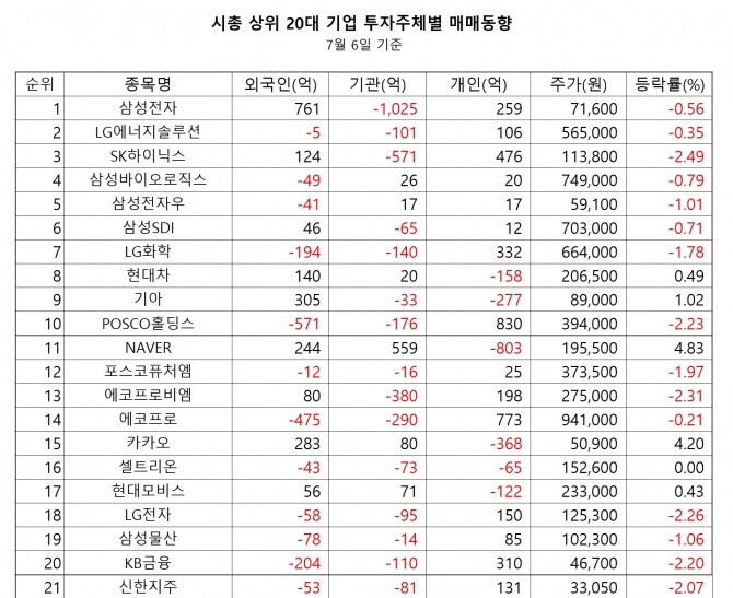 1위 NAVER -803억원(-41만주), 2위 카카오 -368억원(-72만주), 3위 기아 -277억원(-31만주), 4위 현대차 -158억원(-8만주), 5위 현대모비스 -122억원(-5만주), 6위 이수페타시스 -109억원(-37만주), 7위 셀트리온 -65억원(-4만주), 8위 카카오페이 -62억원(-13만주), 9위 OCI -57억원(-4만주), 10위 현대오토에버 -52억원(-3만주), 11위 대한항공 -52억원(-20만주), 12위 에스엘 -51억원(-13만주), 13위 한국타이어앤테크놀로지 -50억원(-14만주), 14위 HD현대중공업 -49억원(-4만주), 15위 현대차2우B -44억원(-4만주), 16위 현대위아 -39억원(-6만주), 17위 삼성에스디에스 -38억원(-3만주), 18위 명신산업 -38억원(-15만주), 19위 KT -36억원(-12만주), 20위 서연이화 -35억원(-15만주)